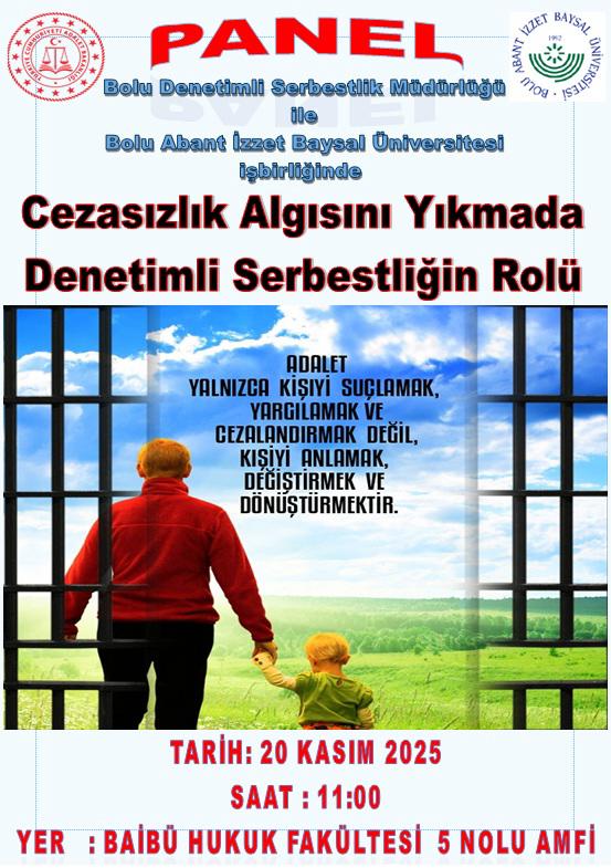 Bolu Denetimli Serbestlik Müdürlüğü ve Bolu Abant İzzet Baysal Üniversitesi Hukuk Fakültesi işbirliğiyle düzenlenen "Cezasızlık Algısını Yıkmada Denetimli Serbestliğin Rolü" konulu panele tüm ilgililer davetlidir.