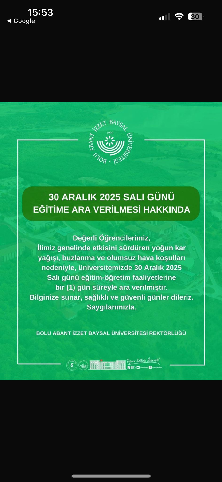 İlimiz genelinde etkisini sürdüren yoğun kar yağışı, buzlanma ve olumsuz hava koşulları nedeniyle, üniversitemizde 30 Aralık 2025 Salı günü eğitim-öğretim faaliyetlerine bir (1) gün süreyle ara verilmiştir.