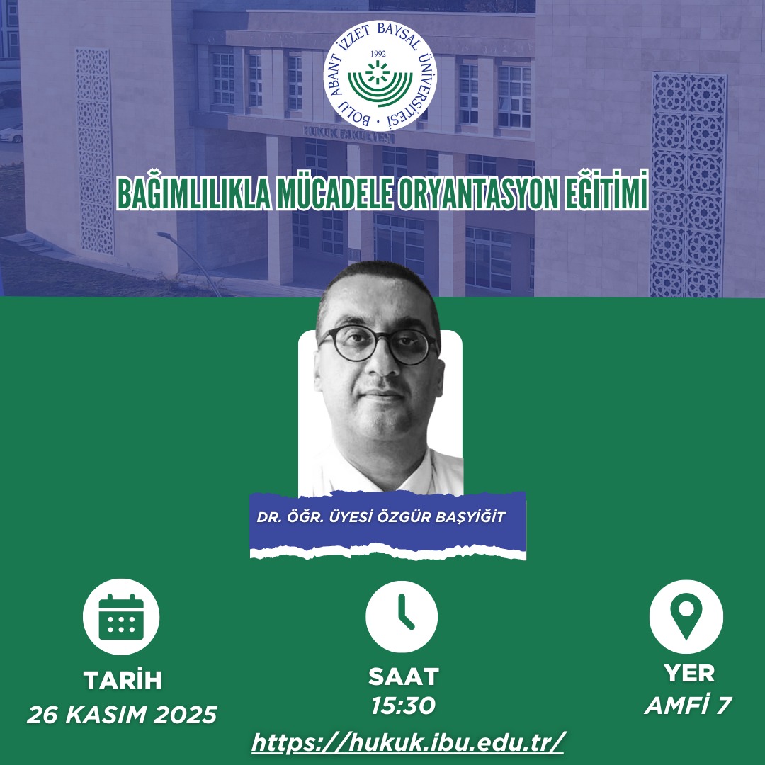 Fakültemiz İş ve Sosyal Güvenlik Hukuku Ana Bilim Dalı Başkanlığından Dr. Öğr. Üyesi Özgür BAŞYİĞİT tarafından, öğrencilerimize yönelik "Bağımlılıkla Mücadele Oryantasyon Eğitimi" verilecektir.