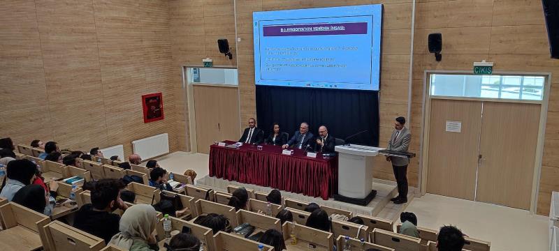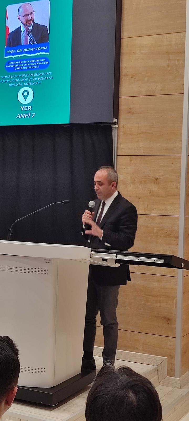 6 Mayıs 2025 tarihinde Hukuk Fakültesi Amfi 7'de "Hukuk Biliminin Temelleri ve Hukuk Metodolojisinin Yeri Konferansı" düzenlendi. Konferans kapsamında alanlarında akademik birikimleriyle önde gelen çok değerli hocalarımız Prof. Dr. O. Gökhan Antalya tarafından "Hukuk Biliminin Temelleri ve Hukuk Metodolojisinin Yeri", Prof. Dr. Faruk Acar tarafından "Kavram Hukukçuluğu ve Menfaat Hukukçuluğu" ve Prof. Dr. Murat Topuz tarafından ise "Roma Hukukundan Günümüze Hukuk Eğitiminde ve Mevzuatta Birlik ve Bütünlük" konularında konuşmalar yapıldı. Konferans boyunca hocalarımız yalnızca kendi konularını aktarmakla kalmayıp, öğrencilerimizin hukuka ve hukukun uygulanmasına dair yönelttiği pek çok soruya içtenlikle yanıt vererek, pratik bilgi ile teorik altyapıyı buluşturan zengin bir etkileşim ortamı sağladılar ve program konuşmacılara yöneltilen sorulara verilen cevaplarla son buldu.