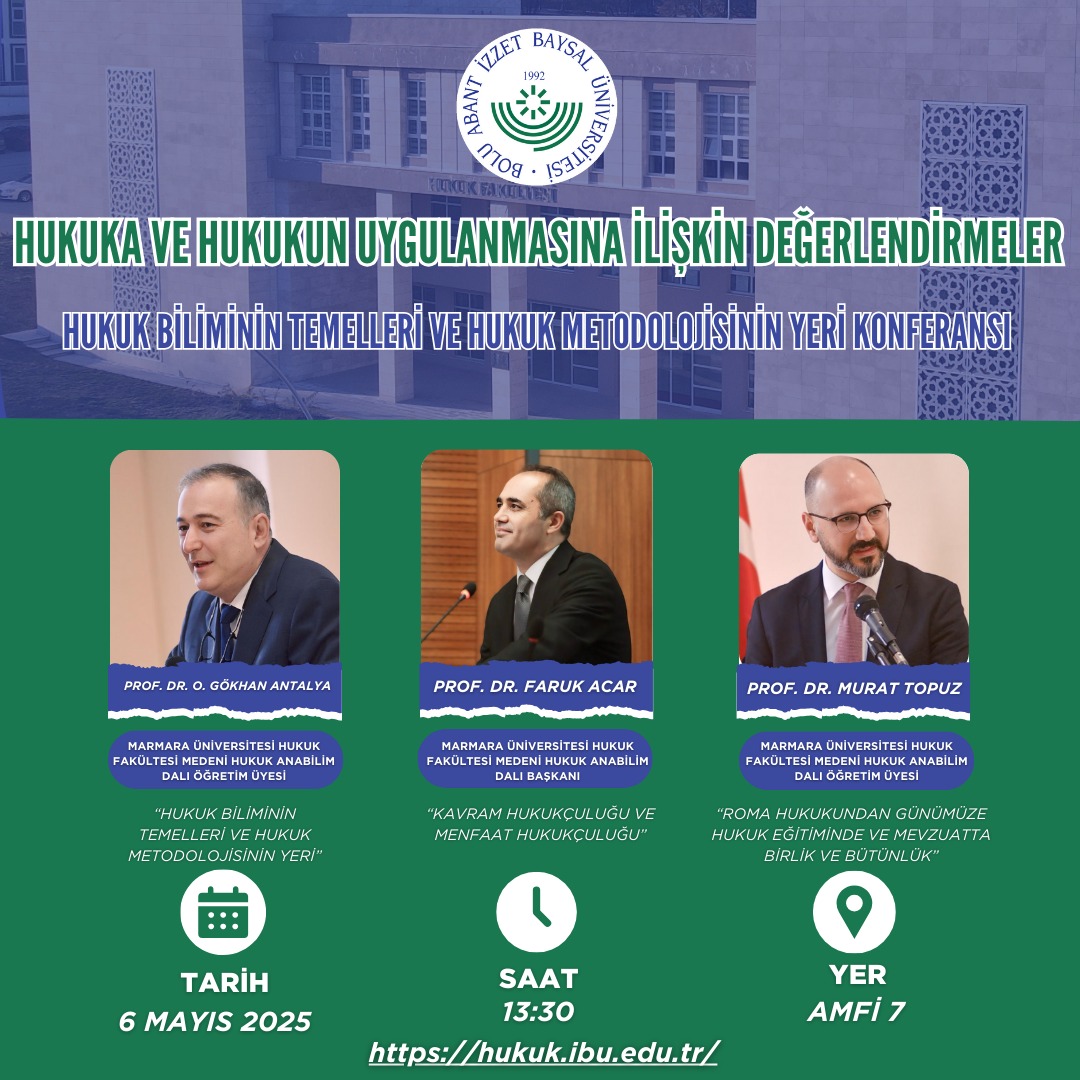 Fakültemizin organize edeceği ve ev sahipliği yapacağı "Hukuk Biliminin Temelleri ve Hukuk Metodolojisinin Yeri Konferansı", Marmara Üniversitesi Hukuk Fakültesi Medeni Hukuk Anabilim Dalı Öğretim Üyesi Prof. Dr. O. Gökhan ANTALYA, Marmara Üniversitesi Hukuk Fakültesi Medeni Hukuk Anabilim Dalı Öğretim Üyesi ve Anabilim Dalı Başkanı Prof. Dr. Faruk ACAR ve Marmara Üniversitesi Hukuk Fakültesi Medeni Hukuk Anabilim Dalı Öğretim Üyesi Prof. Dr. Murat TOPUZ'un katılımlarıyla 6 Mayıs 2025 tarihinde saat 13.30'da Hukuk Fakültesi Amfi 7'de gerçekleştirilecektir.